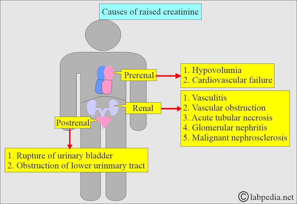 - So renal disorders of the kidneys give rise to an increase in creatinine levels, such as: