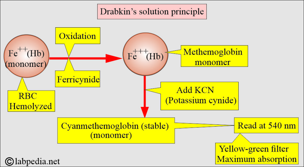 - Whole blood is diluted 1:200 with Drabkin’s solution, which contains potassium ferricyanide and potassium cyanide.