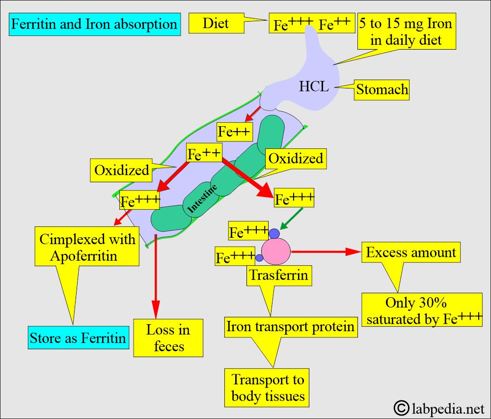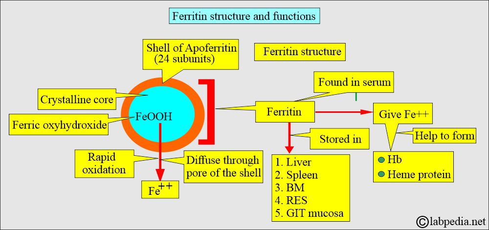- Ferritin is the major body iron storage compound (chief iron-storage protein).