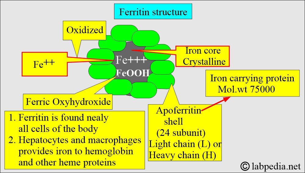 - Ferritin = Ferric oxyhydroxide + Apoferritin
