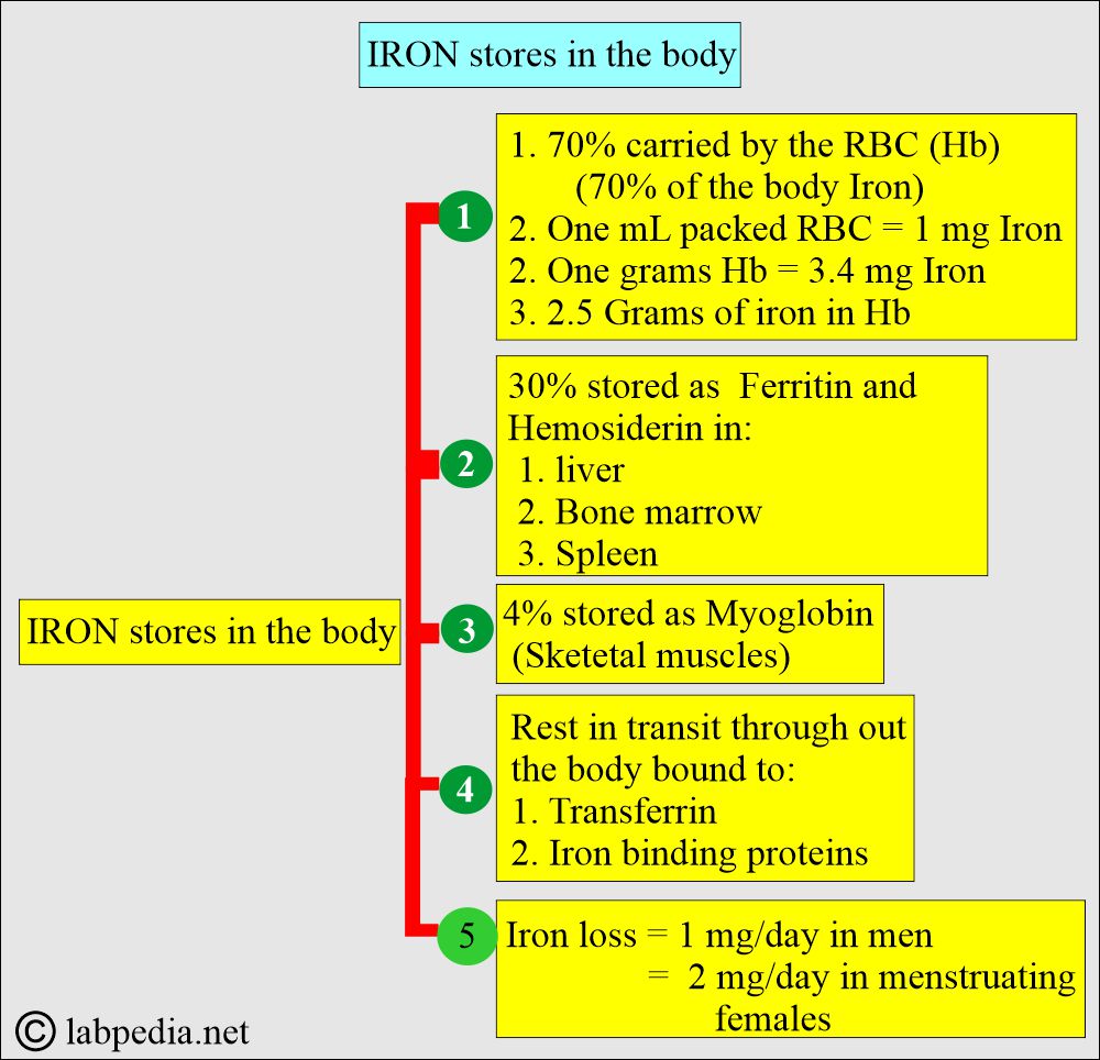 - 30% of iron is stored as ferritin or hemosiderin in the phagocytic and liver cells.