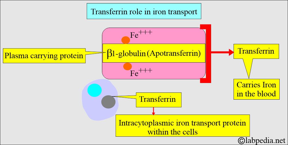 - Apotransferrin is β1-globulin with attached two iron molecules; Fe+++ is called Transferrin.