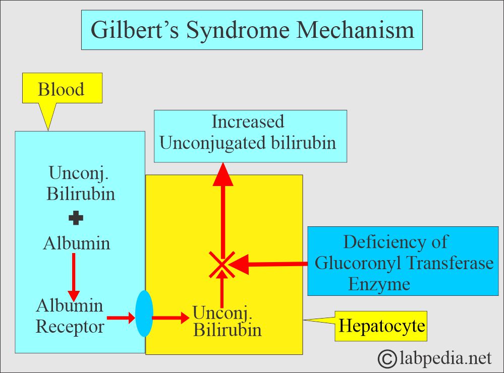 - To understand Gilbert’s syndrome, the following diagram of bilirubin metabolism illustrates the condition.