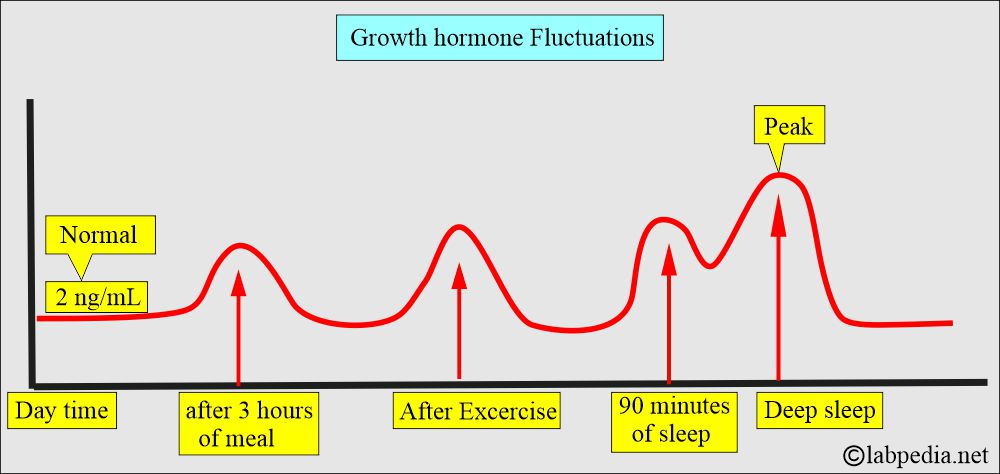 - GH secretion is episodic and variable; the level may reach 40 ng/ml in a healthy subject.