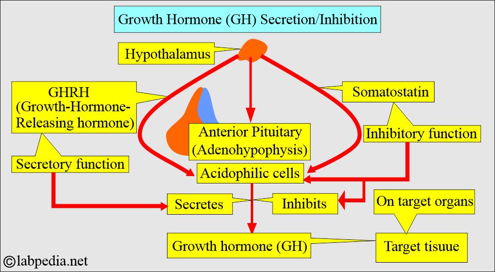 - GH is produced and secreted by somatotropes in response to the hypothalamic secretion of growth hormone-releasing hormone (GHRH) and is inhibited by somatostatin.