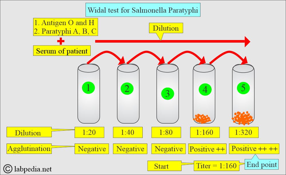 - An agglutination test is done for flagellar H and somatic O antigen with antisera (Salmonella paratyphi A and B).