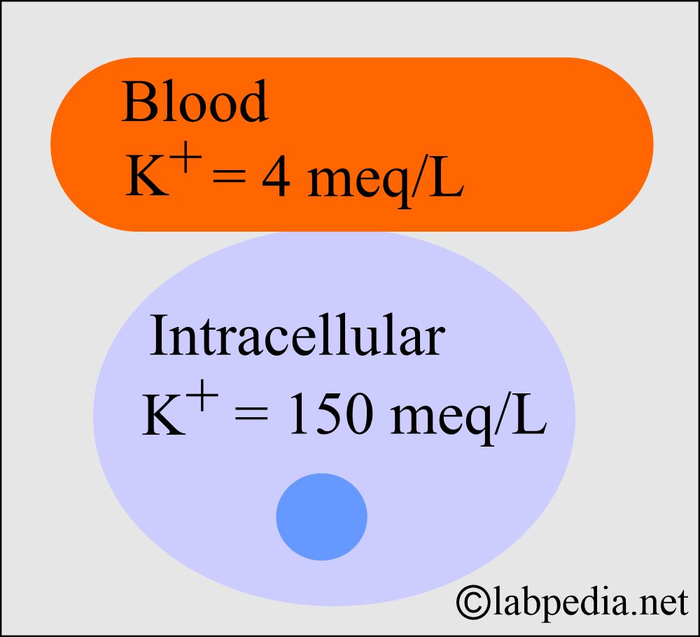 - The intracellular Potassium is 150 meq/L, and in the blood is approximately 4 meq/L.